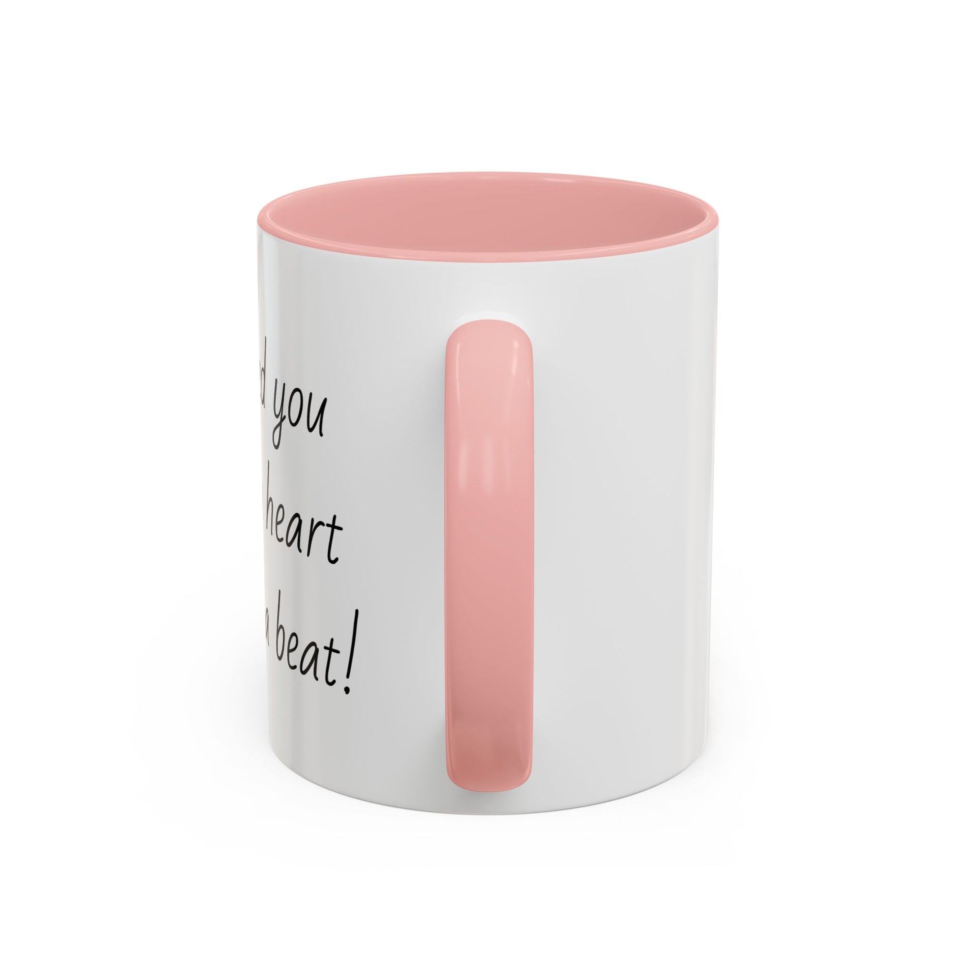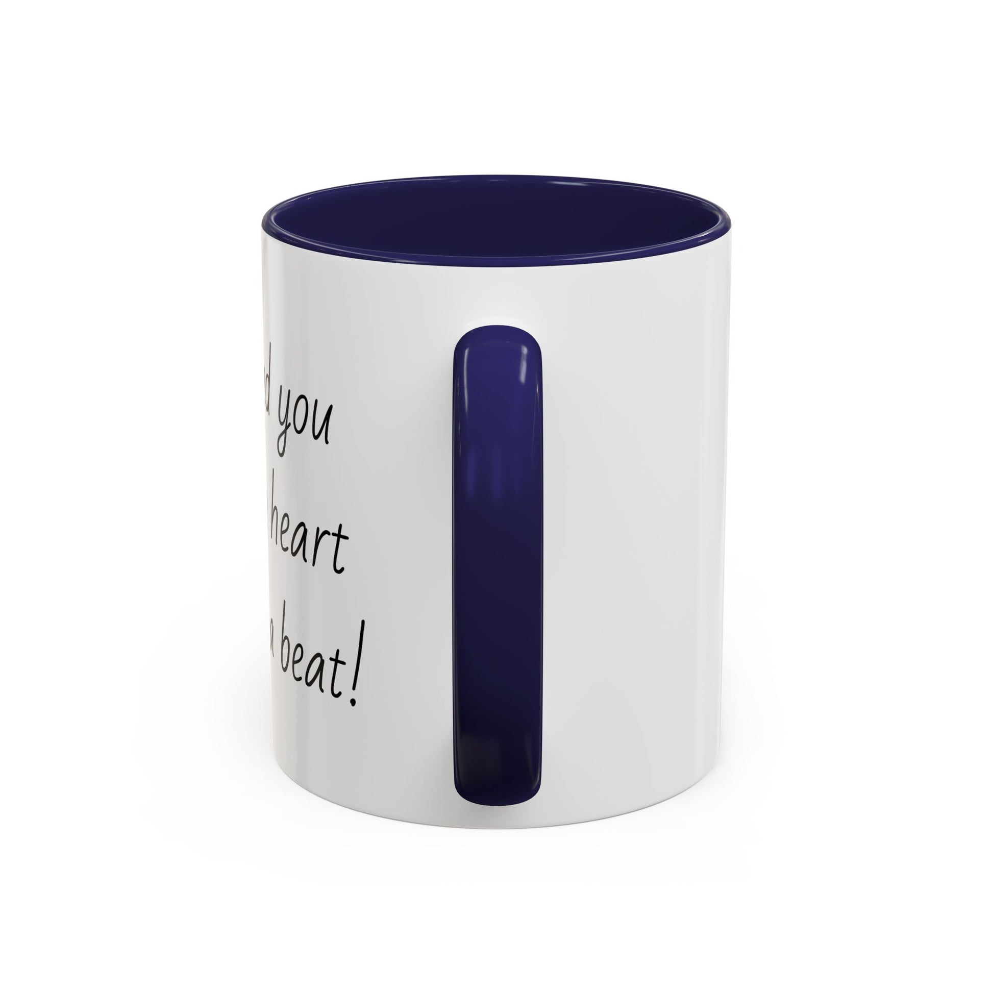 A simple, heartfelt ceramic mug designed for quiet mornings and honest moments. The clean white exterior pairs with a contrasting colored handle and interior to frame the hand-lettered phrase: “I need you like a heart needs a beat.” Lightweight but sturdy, it brings a soft, familiar presence to a desk, bedside table, or kitchen counter. Each sip becomes a small reminder of closeness — whether shared across a video call or left on the counter beside someone sleeping in. The glossy finish makes the script pop while durable printing keeps the message vivid through daily use. Comes in two sizes so the tea- or coffee-lover in your life can choose their comfort level.