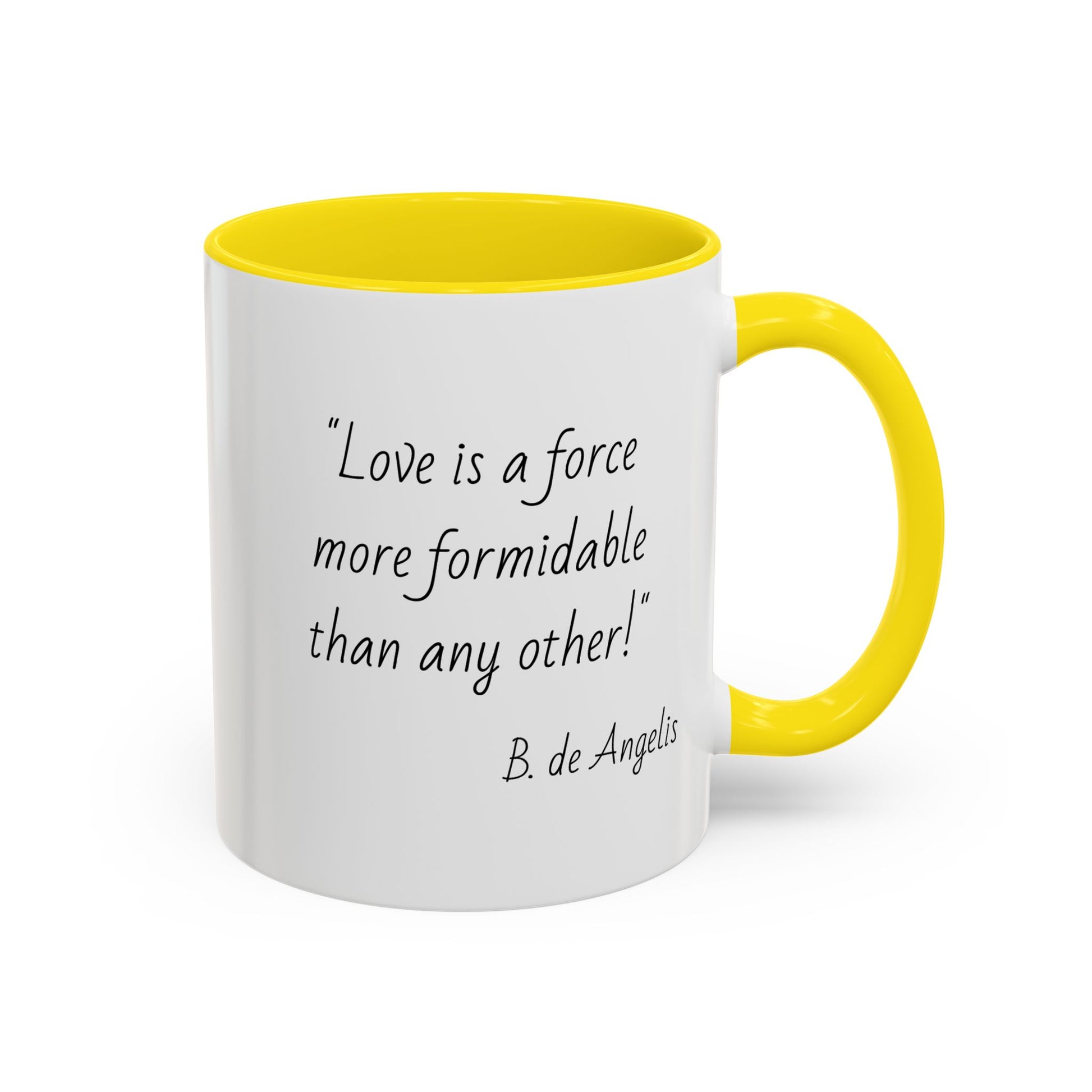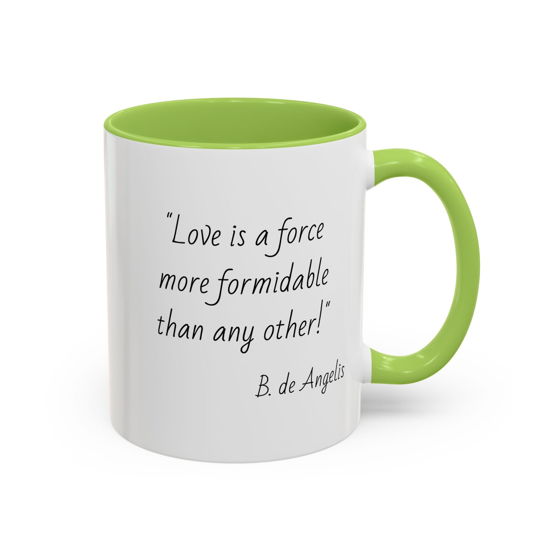This glossy ceramic mug brings calm and thoughtful moments to your morning ritual. The white exterior with a contrasting black interior and handle frames a quiet, handwritten quote that invites reflection: “Love is a force more formidable than any other.” It’s the kind of everyday object that sits on your desk or kitchen counter and gently shifts the tone of your day—sip by sip. Sturdy and bright, the print stays crisp through regular use, while the glossy finish catches light and attention without shouting. Whether it’s for slow mornings, late-night work sessions, or a cozy chat over coffee, this mug creates a small pause that feels intentionally cared for.