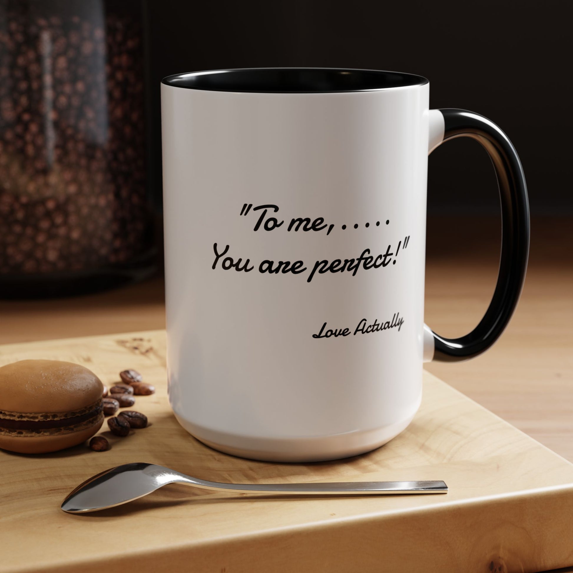 Warm, understated, and a little bit cheeky — this ceramic accent mug brings a small, honest moment to everyday coffee and tea rituals. The glossy white exterior is offset by a colored interior and handle, framing a handwritten-style quote that reads like a private note left on the kitchen counter. It feels like a quiet morning in a lived-in home: familiar, affectionate, and gently humorous. Use it for the slow sips between meetings, the second-cup pick-me-up, or as a token left on someone’s desk to make them smile on a busy day.
